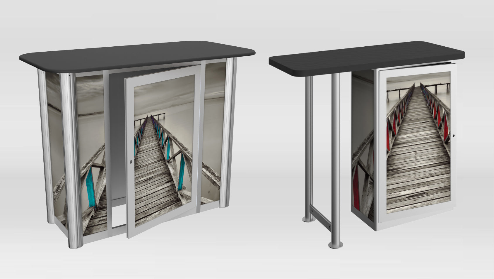 Enhance your booth with Linear Pro Modular Counters where sophistication meets functionality. Featuring durable aluminum extrusion frames and printed graphic panels, these counters deliver a clean, modern look. Each includes a locking door for secure storage and a choice of four laminate countertop finishes to complement any display style.