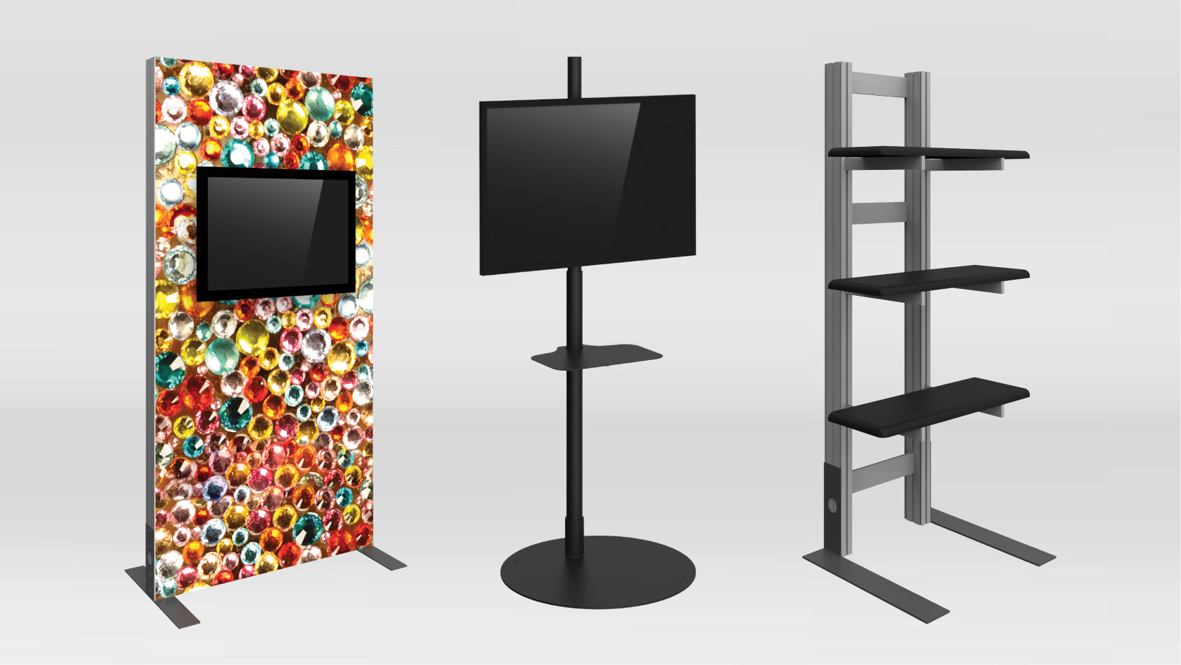 Showcase media and messaging with style using Modular Kiosk Displays. Perfect for showrooms, trade shows, or lobbies, these kiosks combine sturdy aluminum frames with rigid panels or fabric graphics for a sleek, modern look. Add counters, monitor mounts, and tabletops in four finishes to enhance functionality, branding, and versatility. Durable, portable, and elegant.