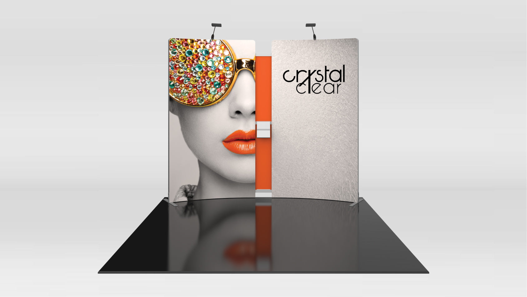 Vector Frame Master 10ft Modular Backwall Kits combine sleek aluminum extrusion frames with push fit SEG fabric graphics for a clean modern look. Accessory options include shelving, literature holders, and lighting. Backlit graphic upgrades are available to enhance visibility and ensure your branding and messaging stand out in any event space.